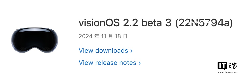 IT之家 11 月 19 日消息,苹果今日向 Vision Pro 用户推送了 visionOS 2.2 开发者预览版 Beta 3 更新(内部版本号:22N5794a),本次更新距离上次发布 Beta / RC 间隔 6 天。