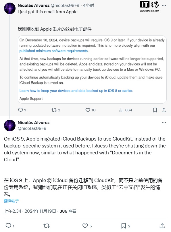 当地时间 2024 年 12 月 18 日起,苹果用户至少需要 iOS 9 版本采用继续通过 iCloud 进行设备备份。对于 iOS 8 或更早版本的 iPhone 或 iPad 设备,用户只能自行将其备份到 Mac 或 Windows PC 上。