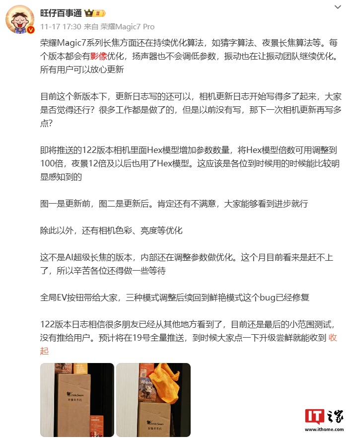IT之家 11 月 19 日消息,前华为首席影像工程师罗巍昨日发布两张水印为“HONOR Magic7 Pro”的照片,并配文“122 版本明天就来了(此处预计指今日),中焦之小王,大王还有等等”。