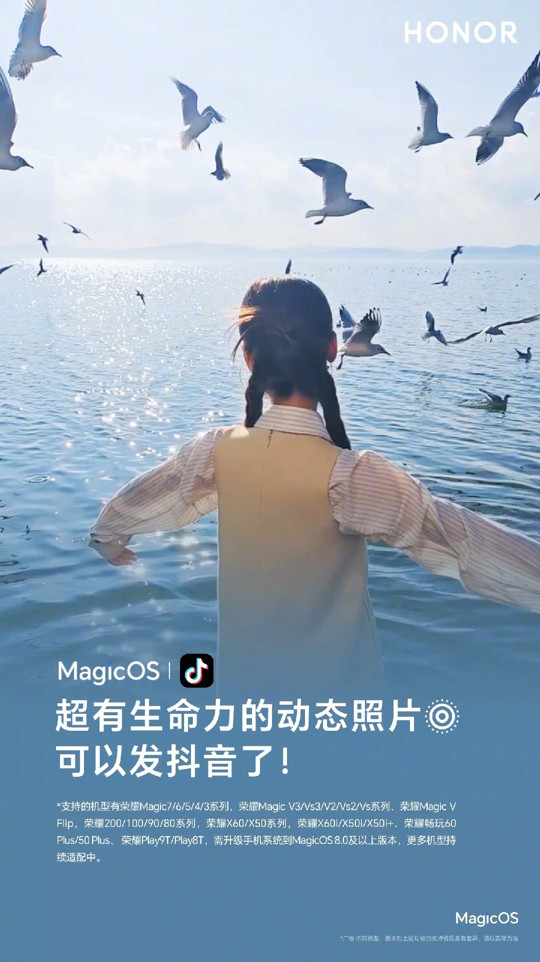 IT之家 11 月 19 日消息,荣耀官方昨日发文宣布多款机型支持在抖音 App 直接发布已拍摄的 Live 动态照片,需升级到 MagicOS 8.0 及以上版本。