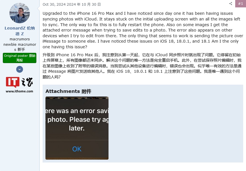 IT之家 11 月 19 日消息,科技媒体 MacRumors 昨日(11 月 18 日)发布博文,报道称在其论坛、Reddit 社区、X 社交媒体平台上,有不少 iPhone 用户反馈升级至 iOS 18 后,照片(Photo)应用无法保存编辑后的照片。