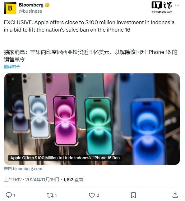 《消息称苹果提议在印尼投资近 1000 万美元,以期解除 iPhone 销售禁令》