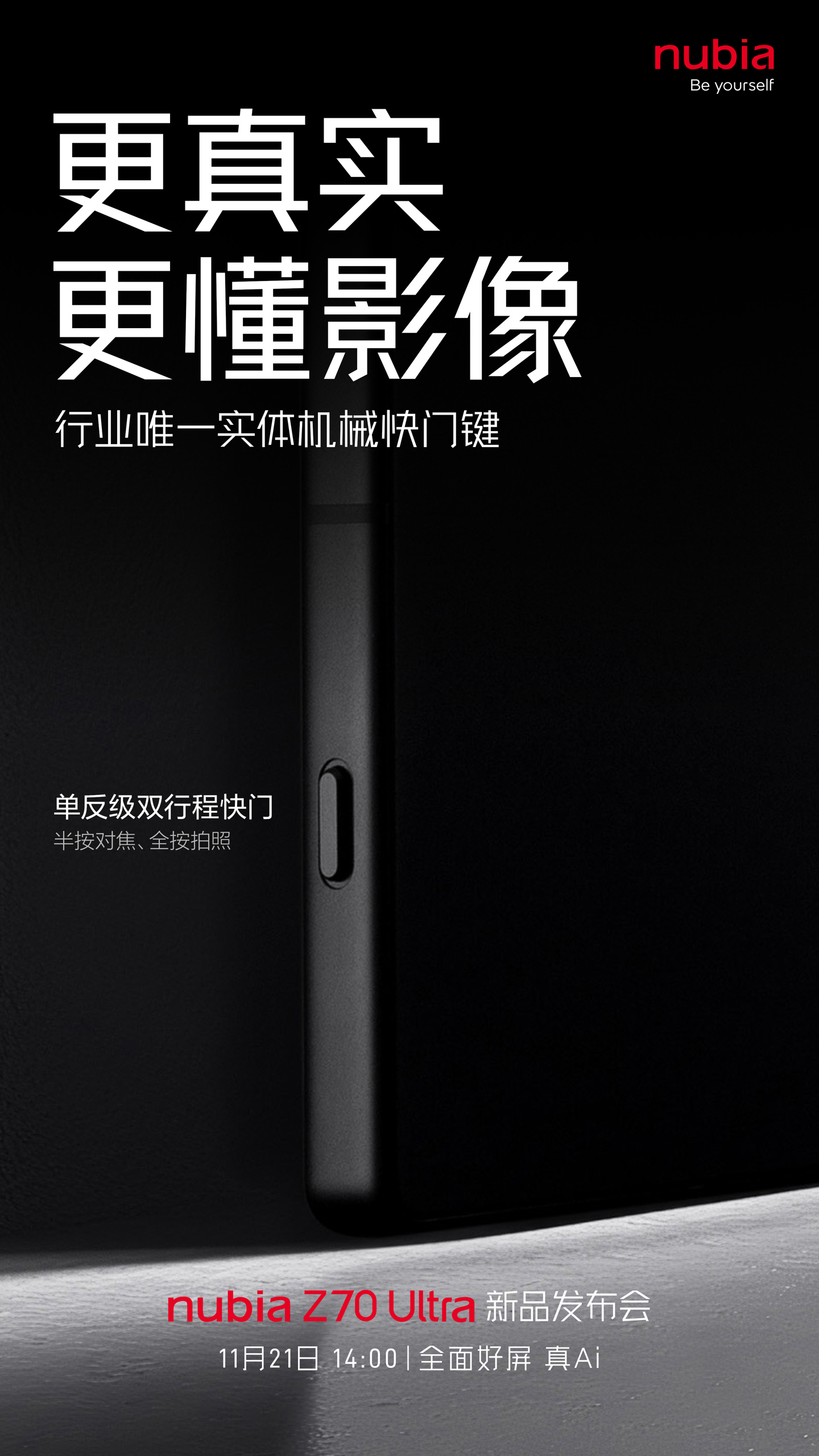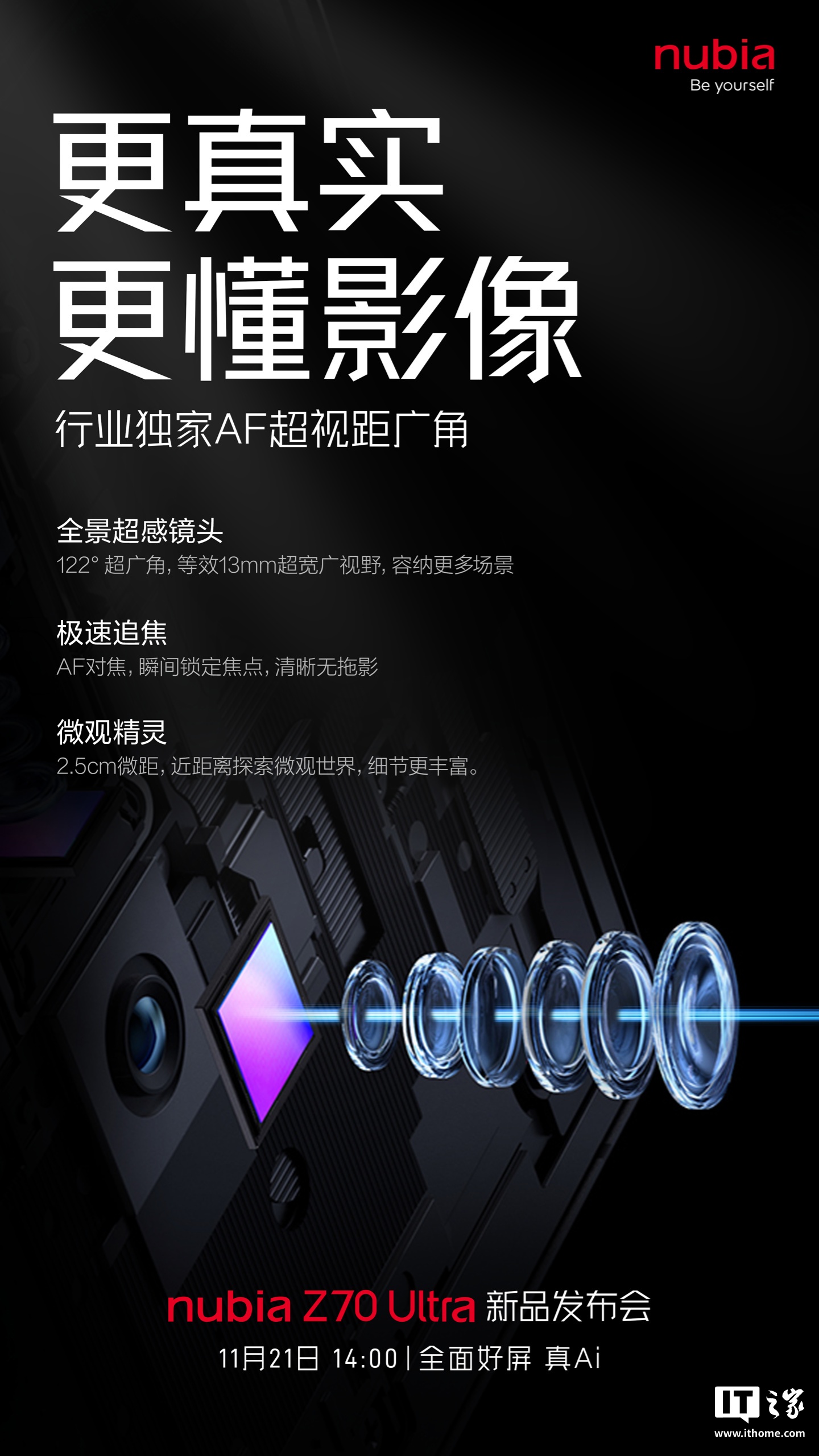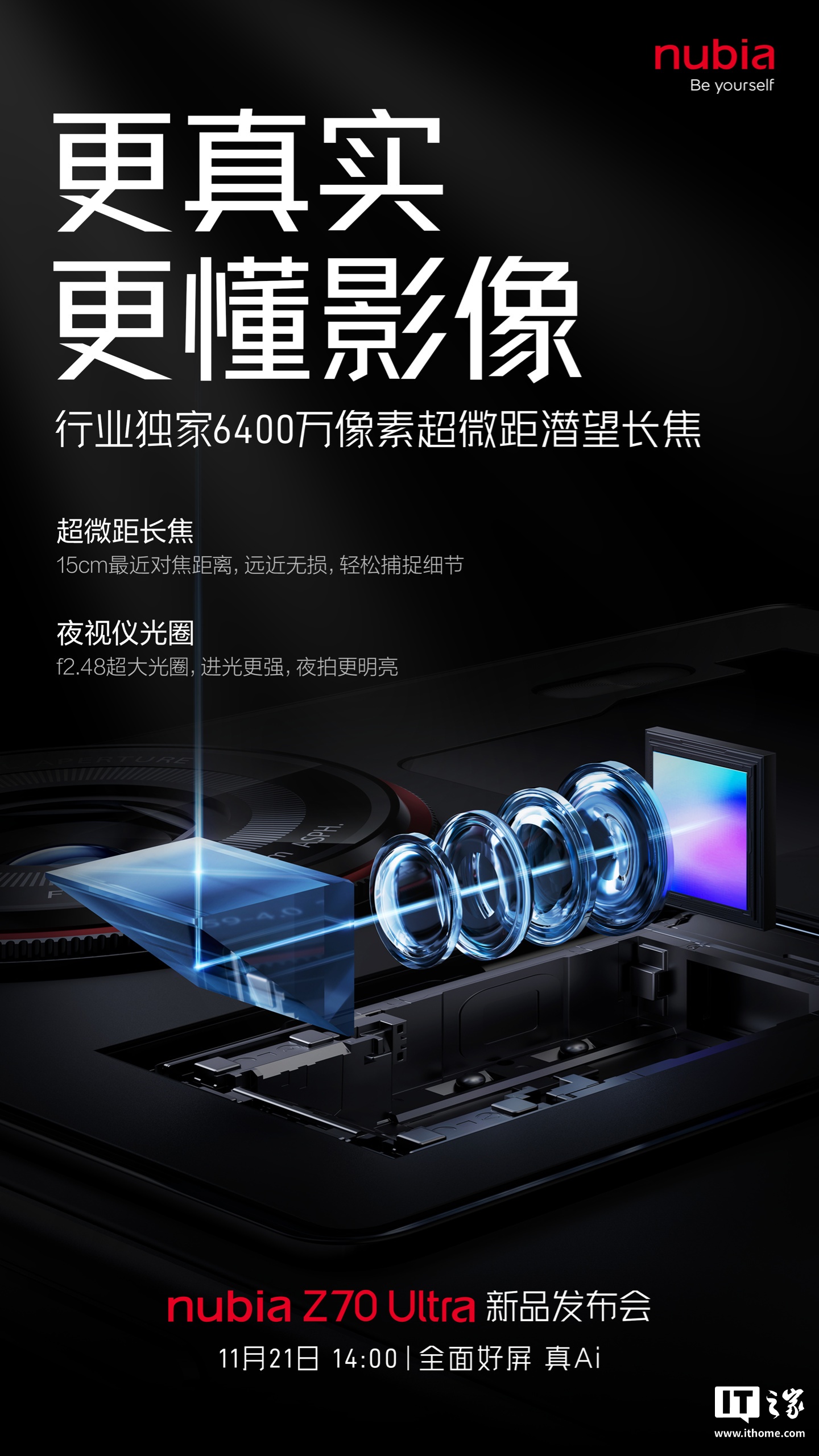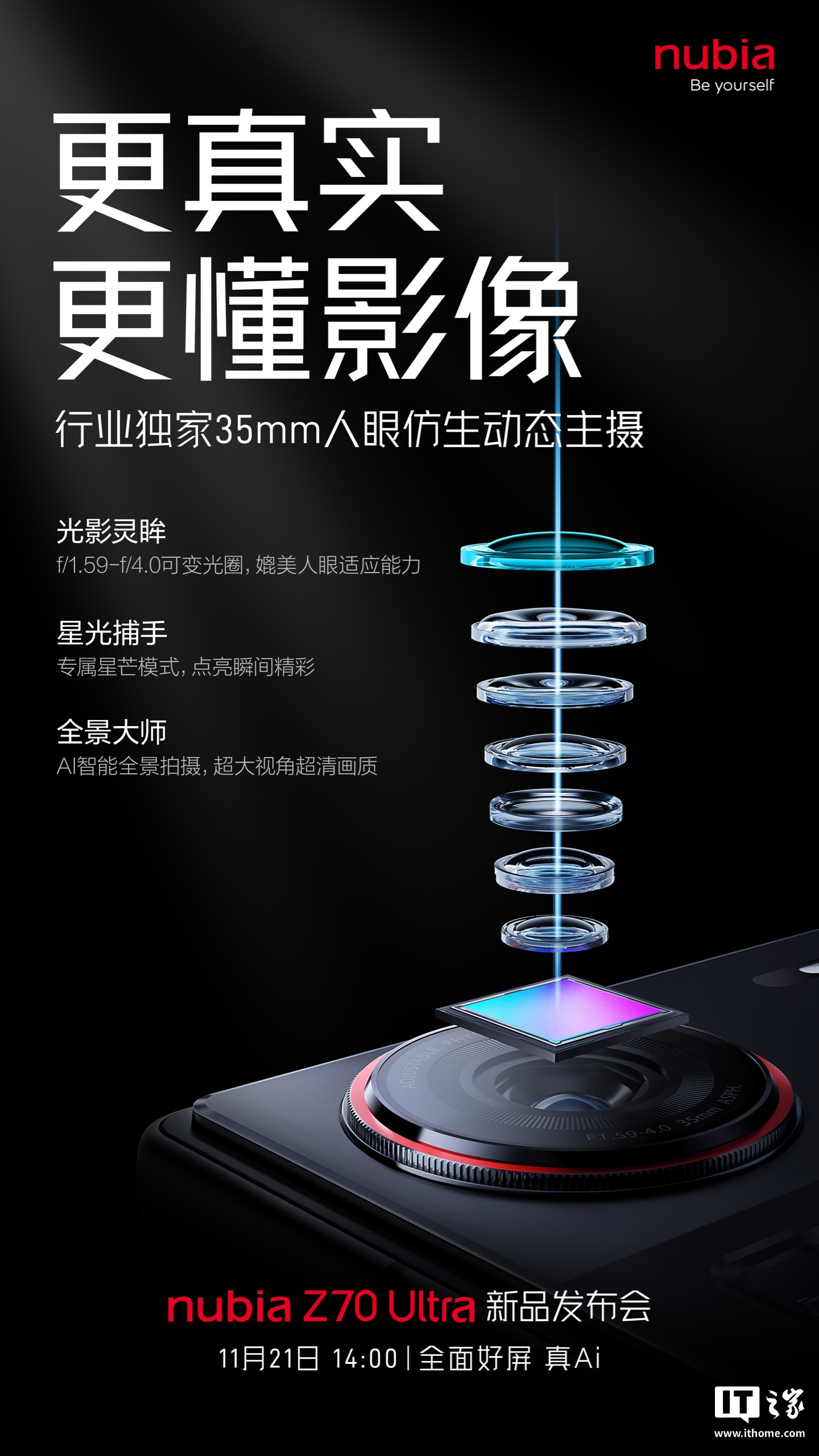 IT之家 11 月 19 日消息,努比亚 Z70 Ultra 手机将于 11 月 21 日 14:00 发布,官方今日公布了新机影像配置信息。