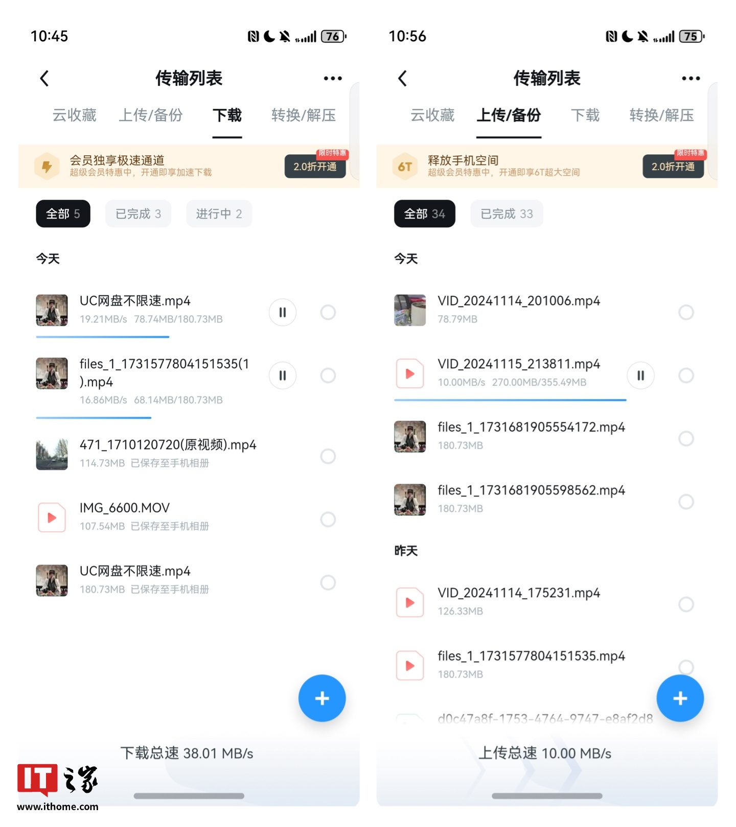 UC 浏览器的“不限速”可谓是网盘市场的一股清流了,下载高清 4G 视频真的快。例如,笔者在测试中上传了一个 100MB 大小的文件,下载速度能达到 40MB/s 左右,上传速度也能超过 10MB/s。