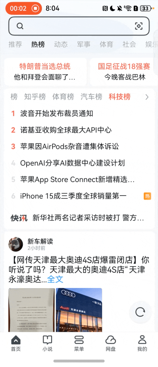 进入浏览器界面,可以看到底部导航栏与安卓版保持一致,分为五个模块:首页、小说、菜单、网盘和我的。首页包括搜索、信息流、热榜等基础功能,体验也几乎和安卓版保持一致。