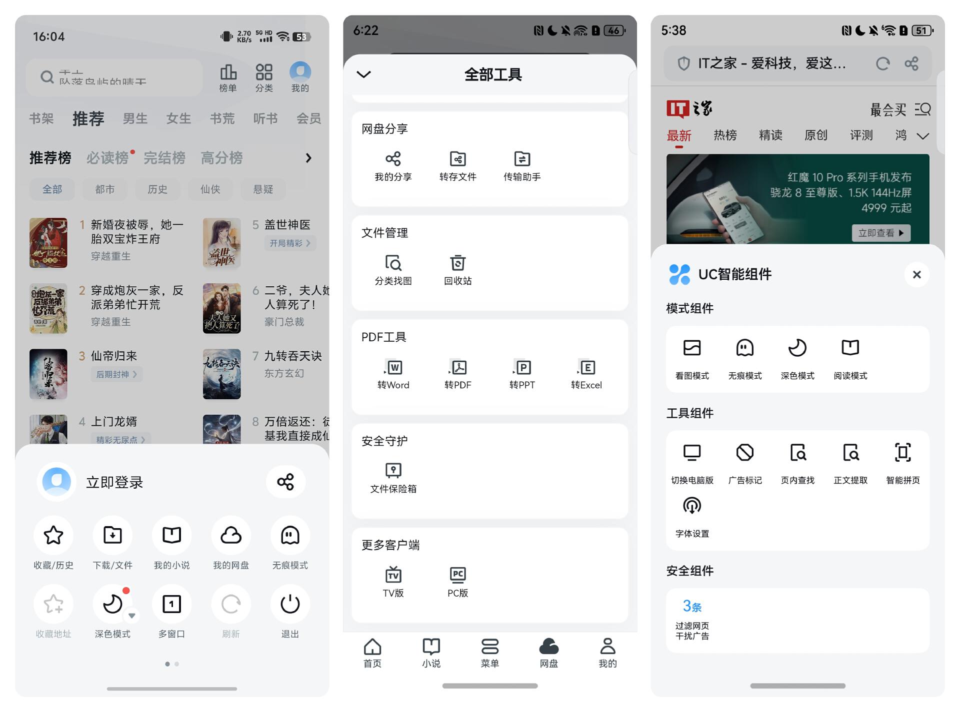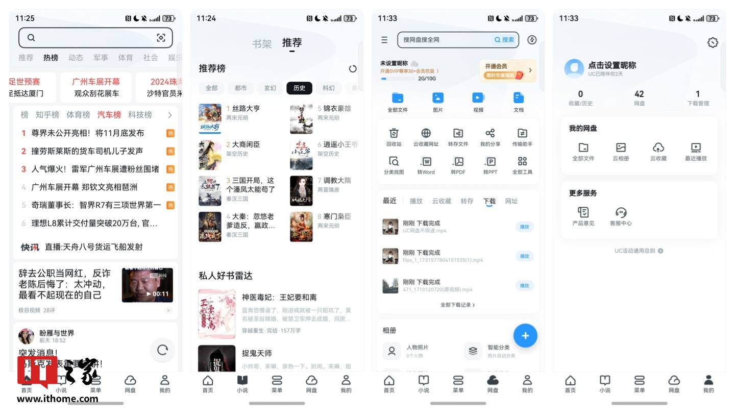 接下来,IT之家介绍 UC 浏览器鸿蒙原生版的两大亮点功能:网盘和小说。