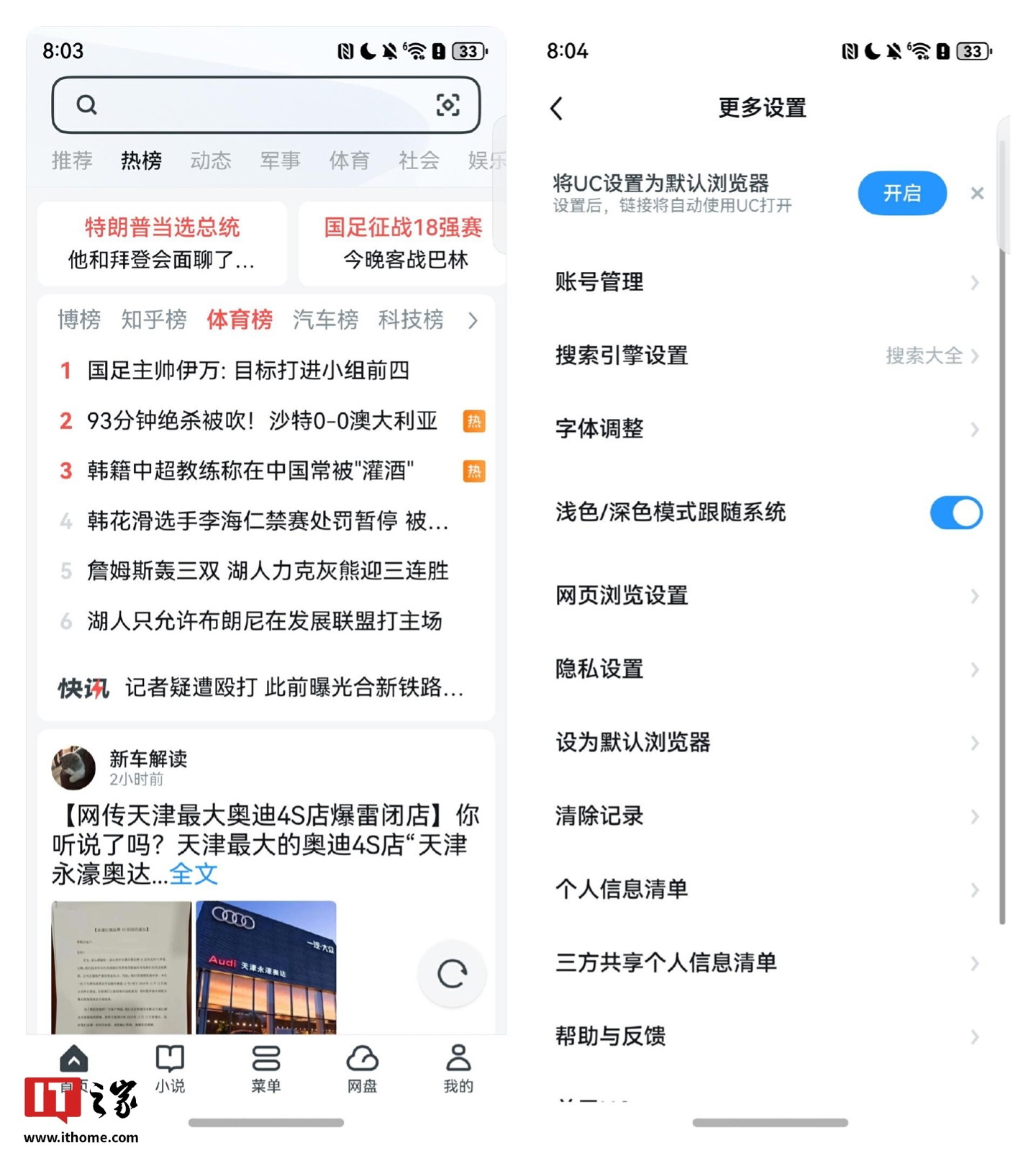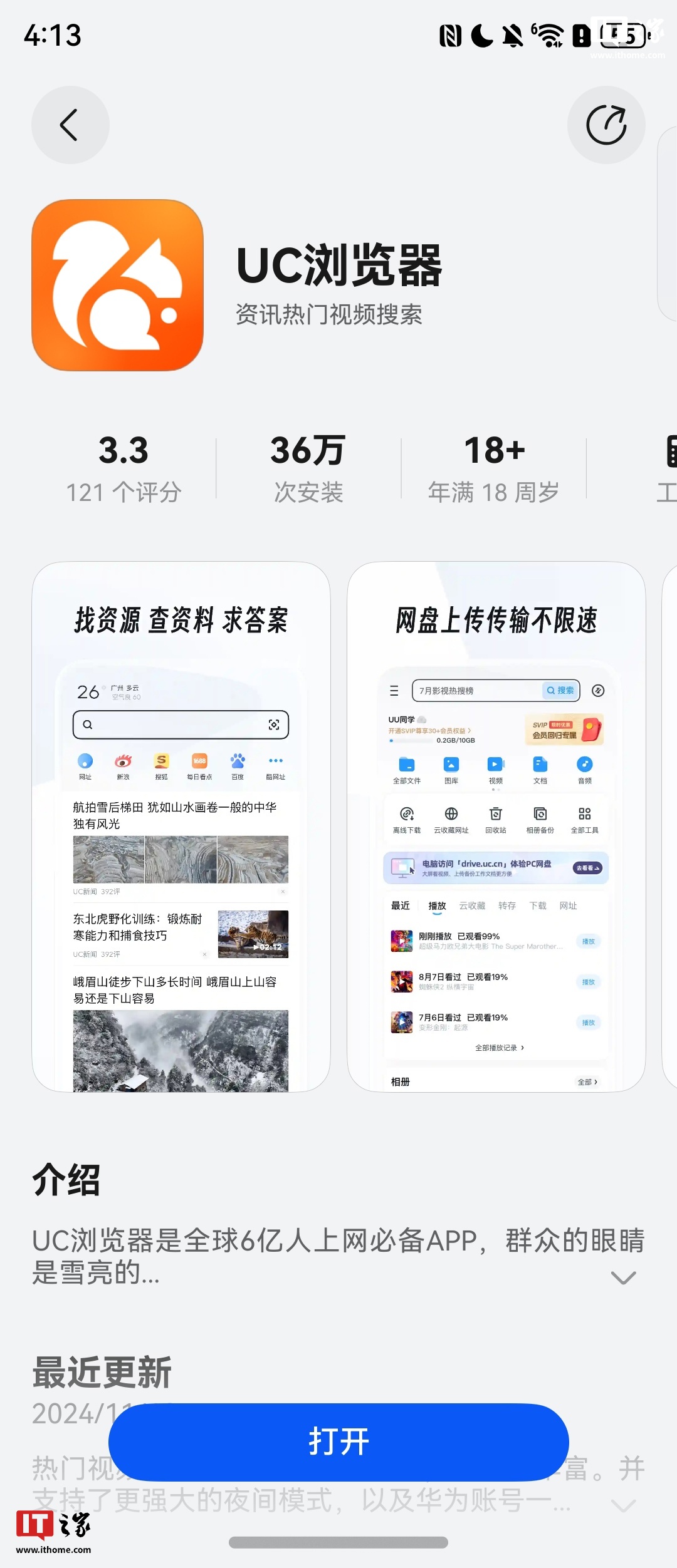 与之对比的是,UC 浏览器鸿蒙原生版已全量上架 HarmonyOS NEXT 应用市场,并且还在持续丰富功能、优化性能,在网盘、小说、资讯等核心应用场景下均可提供流畅、便捷的使用体验。