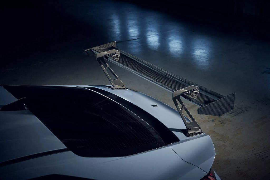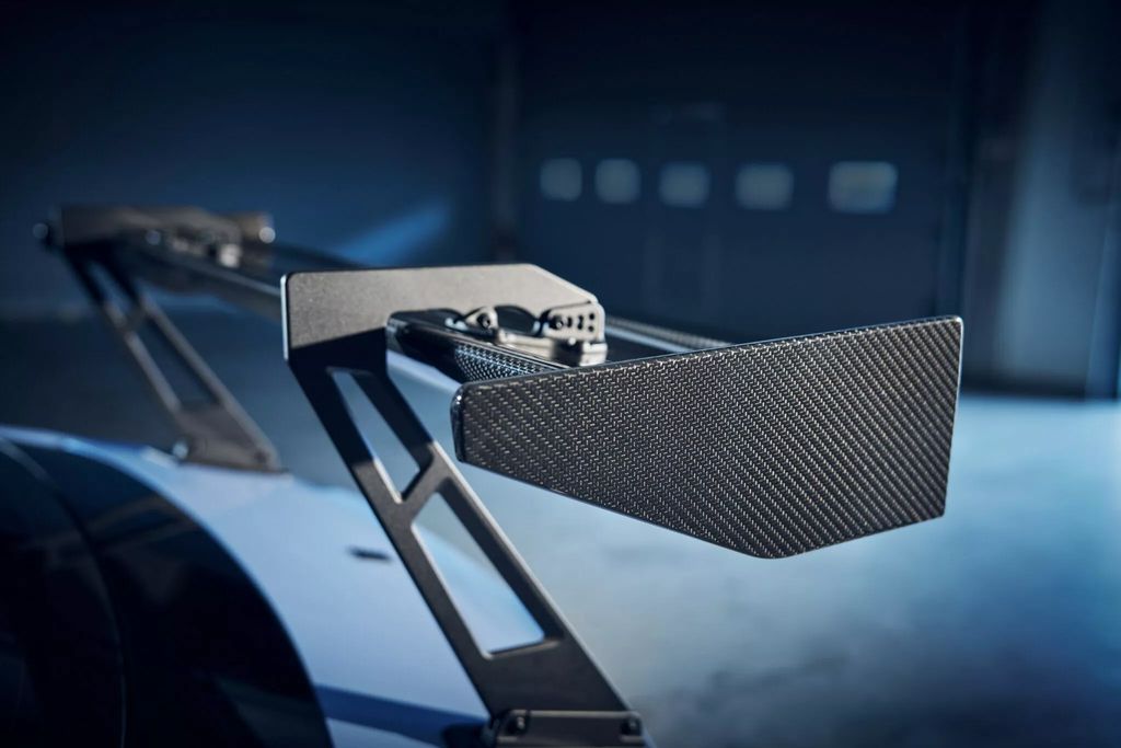外观方面,采用了巨大的碳纤维天鹅颈扰流板,对于真正热爱赛道的车主来说,它能有效保持车辆后部的稳定。