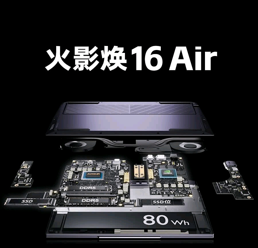 而在最近,网上出现一个奇特的笔记本电脑「爆炸」渲染图,渲染图里的笔记本电脑主板被分拆为四个模块,中间还有一个传统笔记本电脑所没有的硬件模块。虽然渲染图本身除了“火影焕16 Air”的产品名外没有任何的说明,但是发布这张图的人却做了解释:模块化主板。