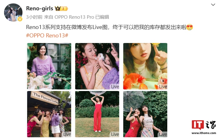 OPPO Reno 系列产品发言人账号 @Reno-girls 今日发文宣布,Reno 13 系列手机将支持在微博发布 Live 图(即实况照片)功能。