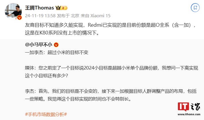 小米中国区市场部副总经理、Redmi 品牌总经理王腾今日对该条微博进行回复:“友商目标不知道多久能实现,Redmi 已实现的是目前份额是超 O 全系(含一加),这是在 K80 系列没有上市的情况下。”