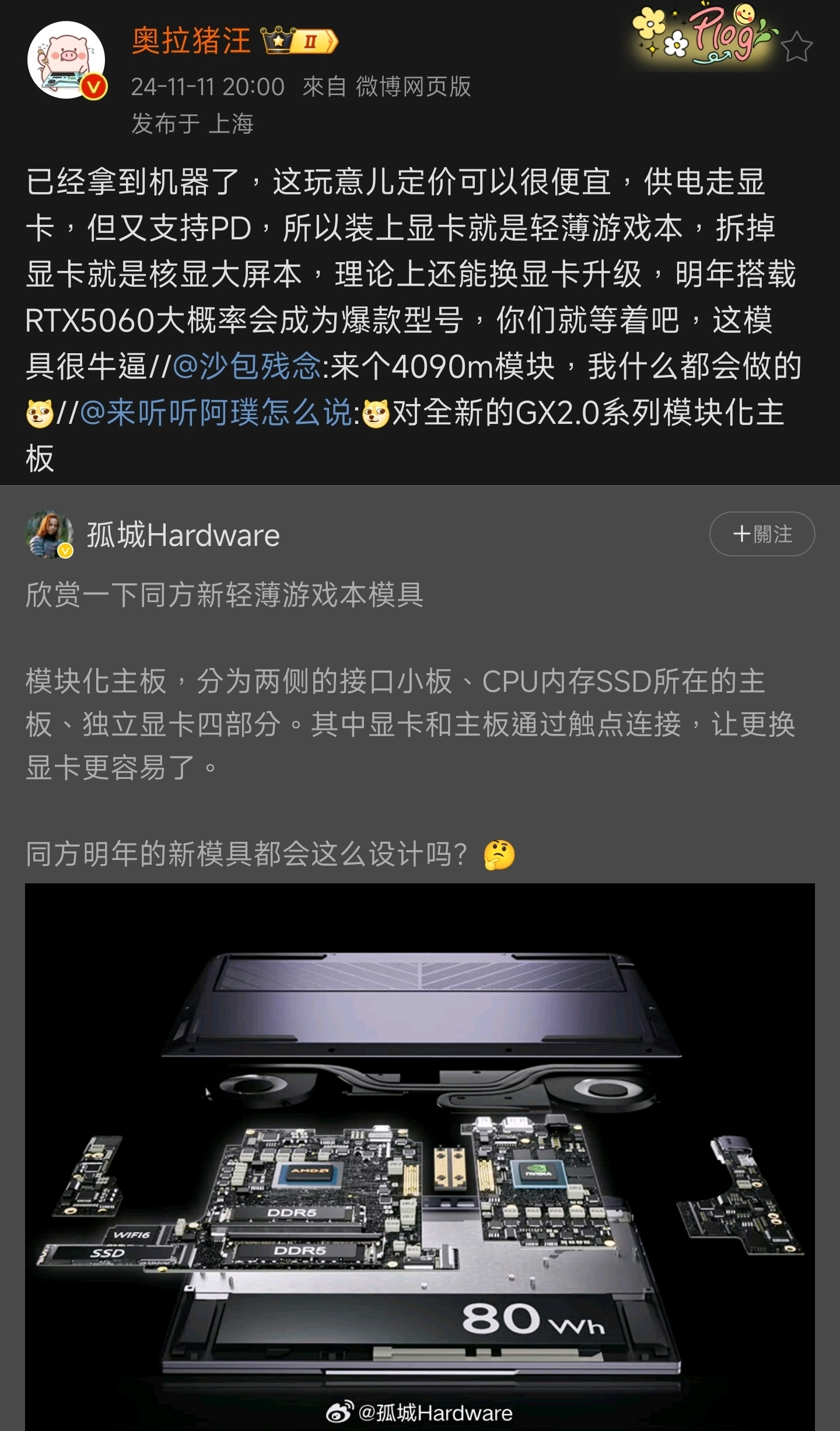 此外,根据转发微博的其他博主提供的信息,可以知道这个模具的型号为GX2.0,并且实际产品已经量产,开始陆续发到一些顶部笔记本电脑评测博主手上。当然,透露的信息还远不止于此,比如博主「奥拉猪汪」就表示GX2.0的模具供电分为两部分,拆掉显卡后CPU可以单独运行。