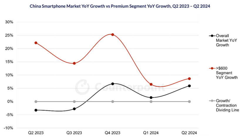 Counterpoint在近期一份报告中指出,各大手机厂商通过加大高端市场投入,寻求更多增长机会的战略背景,则是中国高端市场的增长速度已超过整体智能手机市场。