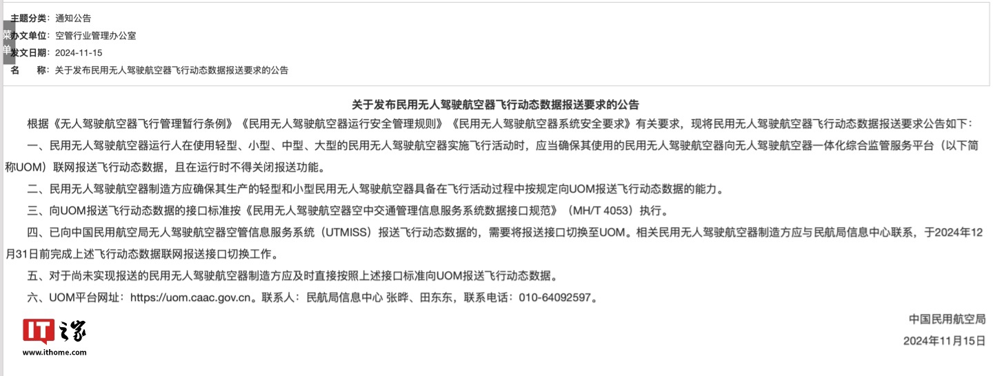 IT之家 11 月 19 日消息,据中国民用航空局 CAAC 官网,11 月 15 日,中国民用航空局发布《关于发布民用无人驾驶航空器飞行动态数据报送要求的公告》。
