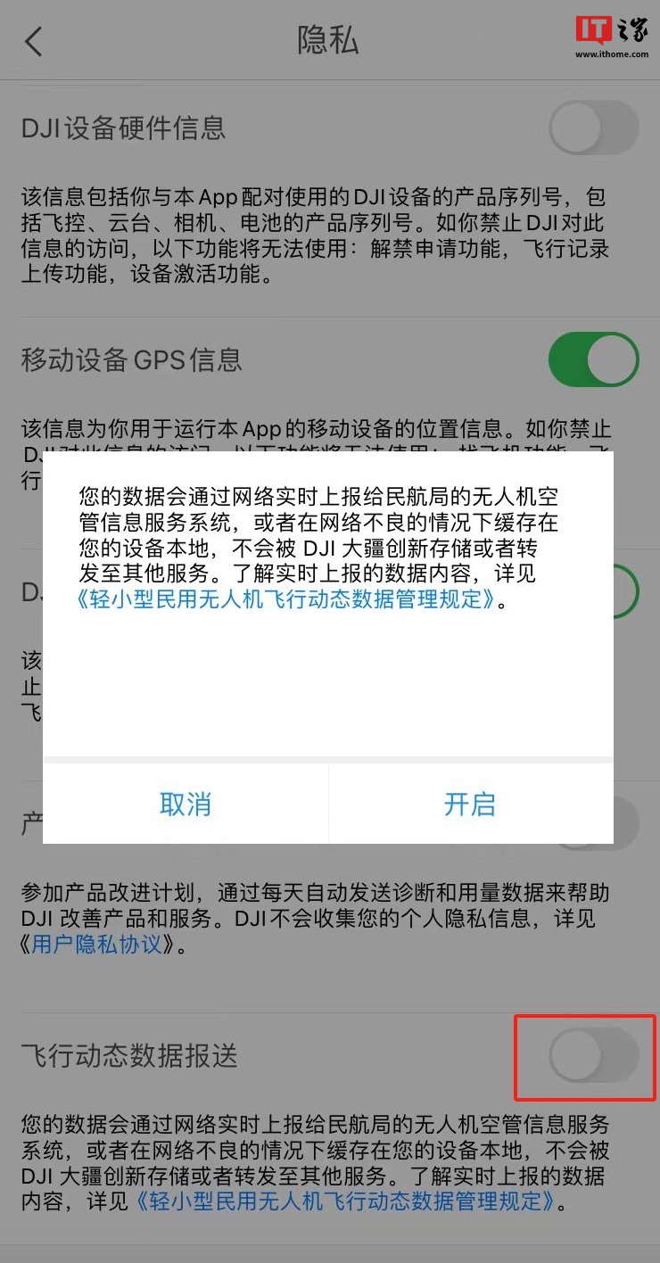 目前国内生产的消费型航拍无人机绝大多数已实装飞行动态数据报送功能,IT之家参考现大疆无人机 App“DJI Fly”,相关功能位于 App 隐私设置页,默认开启。App 声明如下:
