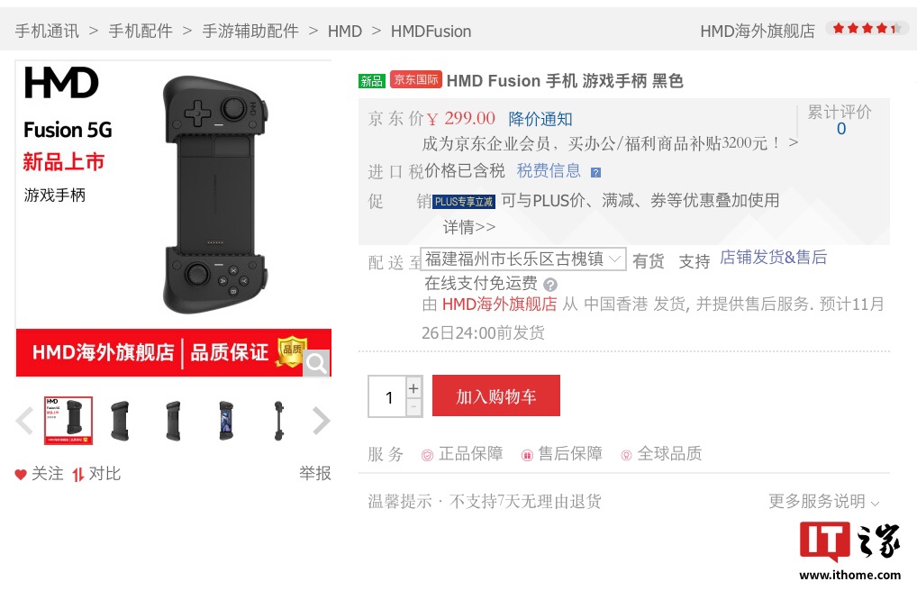 IT之家 11 月 19 日消息,HMD Global 现于京东上架一款适用于 HMD Fusion 手机的游戏手柄,这款手柄主要通过触点形式连接 HMD Fusion 手机,无法兼容其他设备,定价为 299 元。