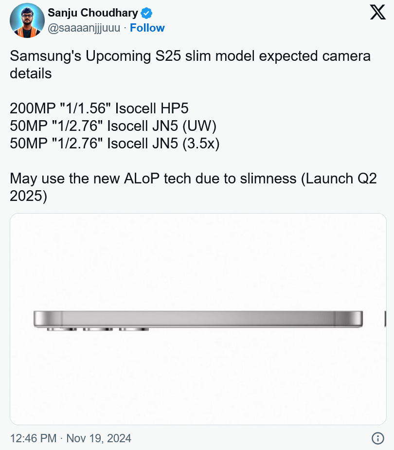 根据Sanju Choudhary 在社交媒体平台 X 上发布的最新帖子,Galaxy S25 Slim 很可能配备 2 亿像素主摄像头。 此外,据猜测,2 亿像素主镜头将采用 ISOCELL HP5 传感器,光圈为 f1/1.56。 该手机还可能配备 5000 万像素超广角镜头和 5000 万像素 3.5 倍光学镜头,两者均采用 ISOCELL JN5 传感器。
