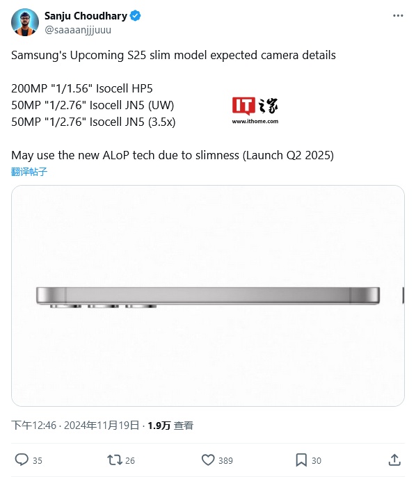 IT之家 11 月 20 日消息,消息源 Sanju Choudhary 昨日(11 月 19 日)在 X 平台发布推文,曝料称三星将于 2025 年第 2 季度发布 Galaxy S25 Slim 最薄旗舰手机,可能会使用最新发布的 ALoP 相机技术。
