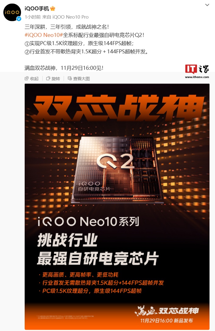 IT之家 11 月 20 日消息,iQOO 手机官方今日发文预热,Neo 10 系列手机将全系标配自研电竞芯片 Q2,支持 PC 级 1.5K 纹理超分、原生级 144FPS 超帧,同时行业首发无需散热背夹 1.5K 超分+144FPS 超帧并发。