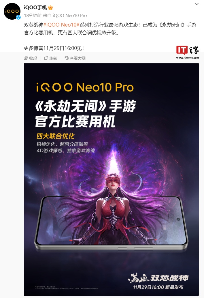 另外,根据 iQOO 官方预热,iQOO Neo10 Pro 手机还成为了《永劫无间》手游官方比赛用机,拥有联合调优视效升级,包括:稳帧优化、超感分区触控、4D 游戏振感、独家游戏滤镜。