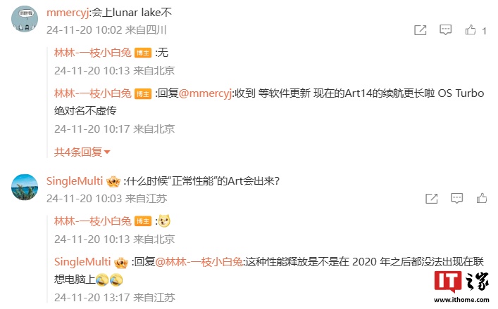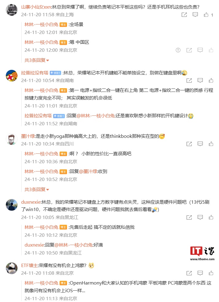 IT之家 11 月 20 日消息,联想前产品经理 @林林-一枝小白兔 在今年 4 月 30 日发文称已离开联想公司。他今日在自己微博评论区透露,已于本月初入职荣耀。
