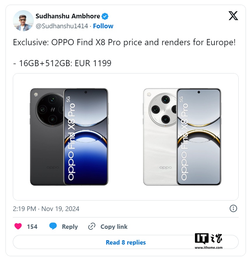 爆料者 Sudhanshu Ambhore 在社交媒体上透露了 Find X8 Pro 在欧洲市场的定价,消息称,配备 16GB RAM 和 512GB 存储的 Find X8 Pro 在欧洲市场售价为 1199 欧元(IT之家备注:当前约 9186 元人民币)。