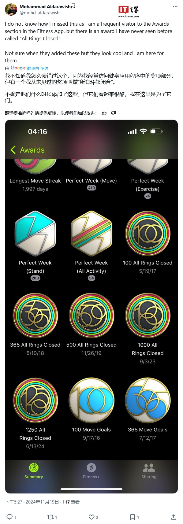 IT之家 11 月 21 日消息,科技媒体 MacRumors 昨日(11 月 20 日)发布博文,报道称苹果公司在 iOS 18.2 和 watchOS 11.2 更新中,为 Apple Watch 添加了全新的“All Rings Closed”活动奖励。