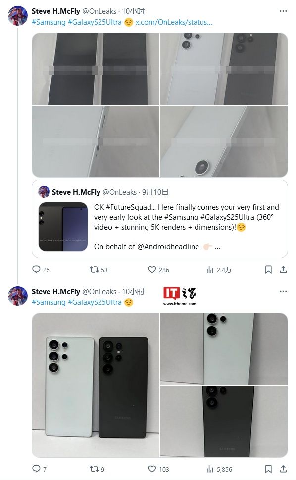 IT之家 11 月 21 日消息,消息源 @OnLeaks 今天(11 月 21 日)在 X 平台发布系列推文,再次分享了一组三星 Galaxy S25 Ultra 手机的机模照片。