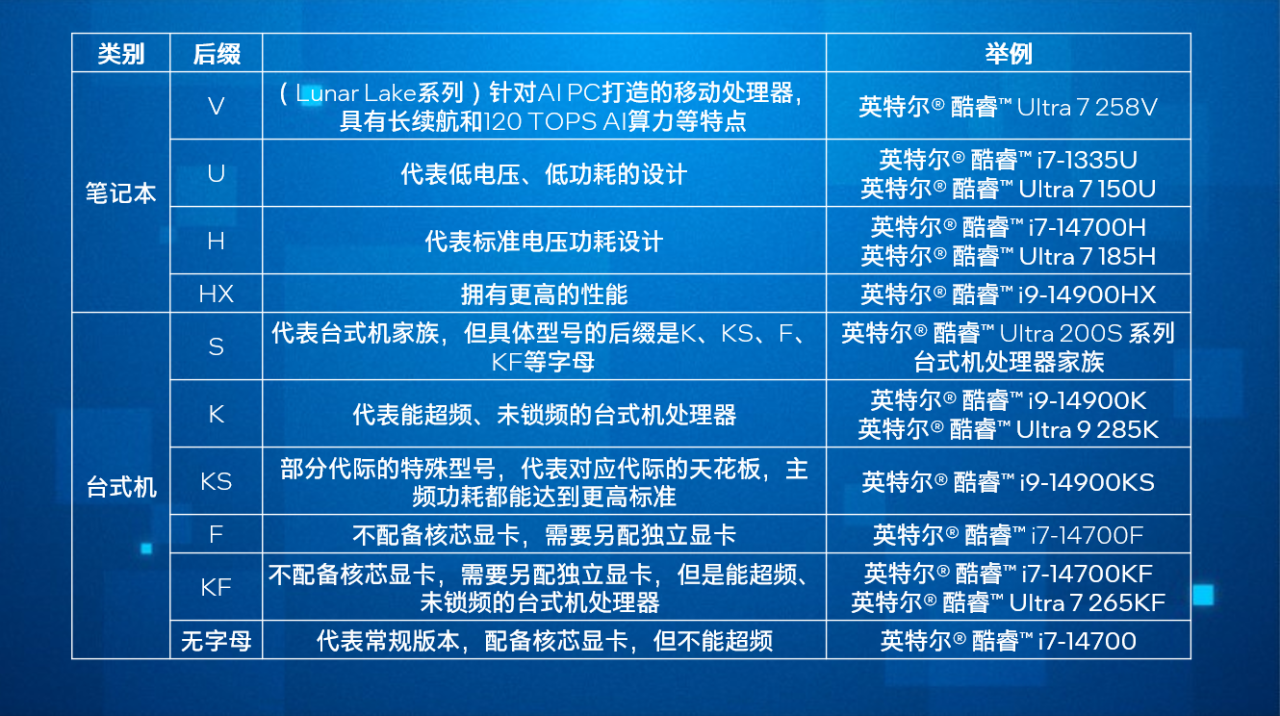 结尾是K,就代表能超频、未锁频的台式机处理器,比如英特尔酷睿i9-14900K,英特尔酷睿Ultra 9 285K。