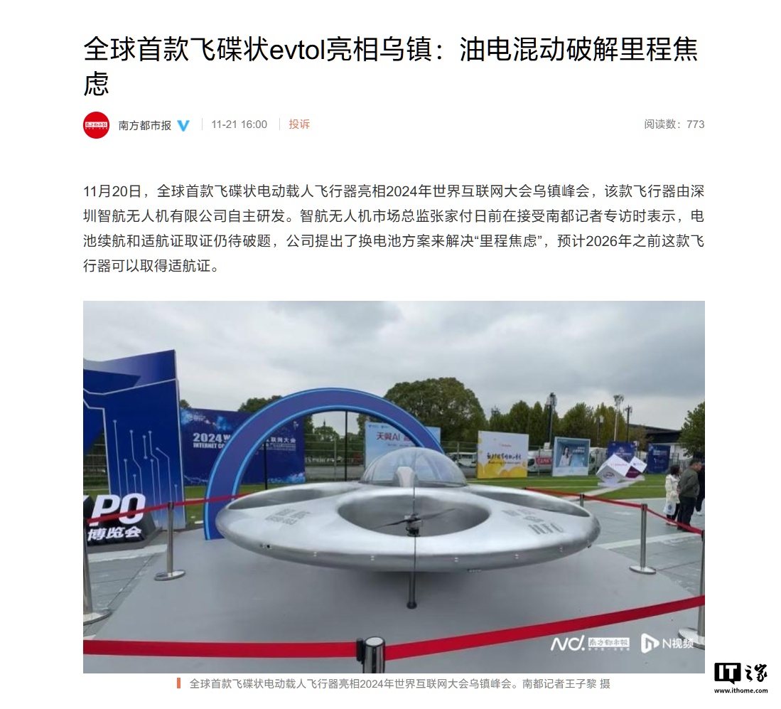 IT之家 11 月 21 日消息,据《南方都市报》今日报道,昨日的 2024 年世界互联网大会乌镇峰会上,深圳智航无人机有限公司自主研发的电动载人飞行器正式亮相,这也是全球首款飞碟状电动载人飞行器。