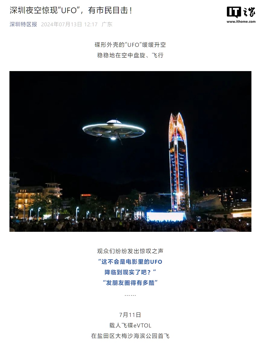 《载人飞碟 eVTOL 深圳盐田首飞:旅游场景专用,飞行高度 10-30 米》