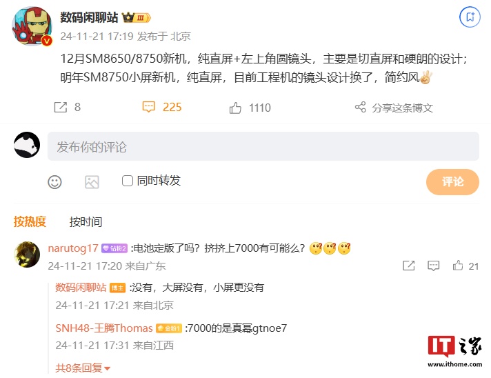 IT之家 11 月 21 日消息,博主 @数码闲聊站 今日发文透露,某厂 12 月 SM8650 / 8750 新机(骁龙 8 Gen3 / 骁龙 8 至尊版)采用纯直屏 + 左上角圆镜头设计。结合评论区讨论与暗号来看,预计为一加 Ace 5 系列手机。