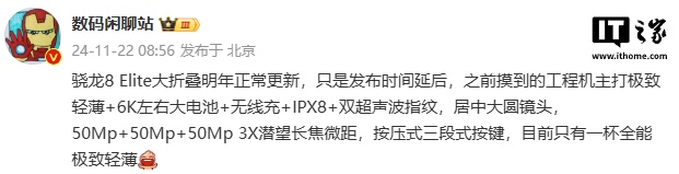 该博主透露,之前摸到的工程机主打极致轻薄 + 6K 左右大电池 + 无线充 + IPX8 + 双超声波指纹,居中大圆镜头,50Mp+50Mp+50Mp 3X 潜望长焦微距,按压式三段式按键,目前只有一杯全能极致轻薄。