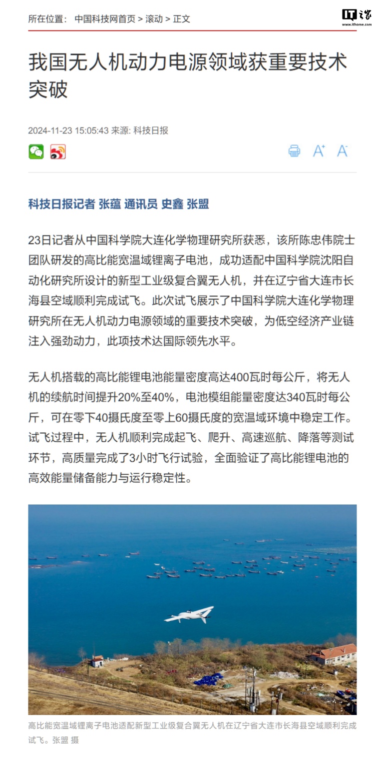 IT之家 11 月 23 日消息,据《科技日报》今日消息,中国科学院大连化学物理研究所陈忠伟原始团队研发的高比能宽温域锂离子电池,成功适配中国科学院沈阳自动化研究所设计的新型工业级复合翼无人机,并在辽宁省大连市长海县空域顺利完成试飞。