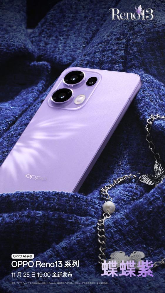 OPPO Reno13系列带来了全新配色“蝶蝶紫”,采用蝶影光刻工艺,同时还有星河蓝、午夜黑配色,以及 Pro 版本的星光粉配色。