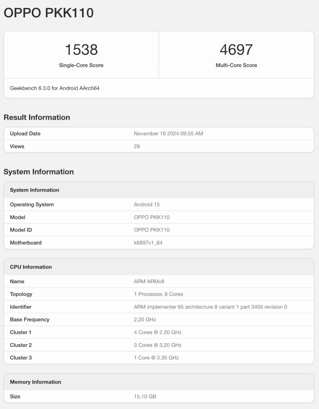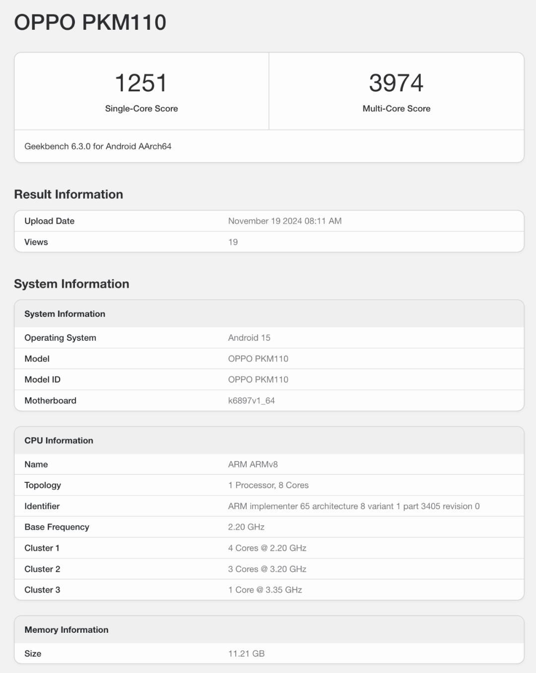 相关消息显示Reno13型号为PKM110,而Reno13 Pro型号为PKK110,Geekbench后台显示Reno13单核成绩在1250+,多核成绩3900±,12GB运存,搭载的处理器CPU频率为1*3.35GHz、3*3.2GHz、4*2.2GHz,消息称对应联发科天玑8350。