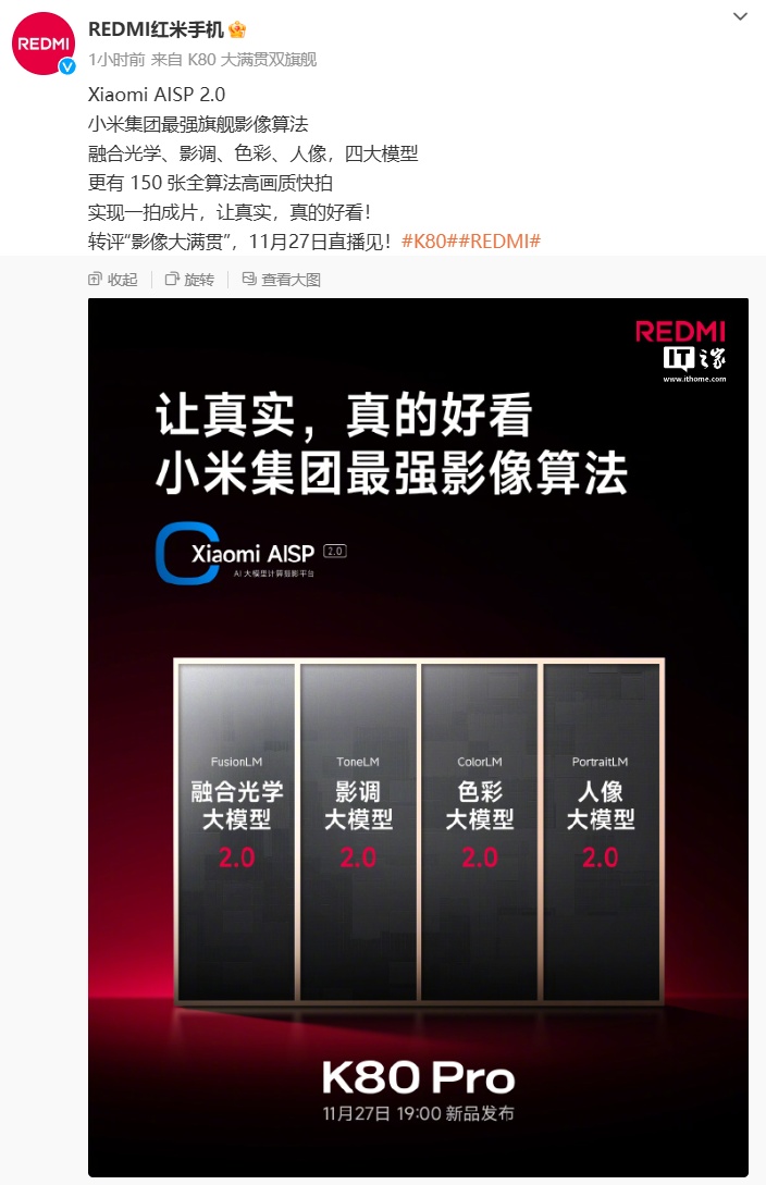 IT之家 11 月 25 日消息,小米官方今日公布了 REDMI K80 系列手机影像部分的配置信息,新机将内置 Xiaomi AISP 2.0,拥有融合光学大模型 2.0、影调大模型 2.0、色彩大模型 2.0、人像大模型 2.0,支持 150 张全算法高画质快拍。