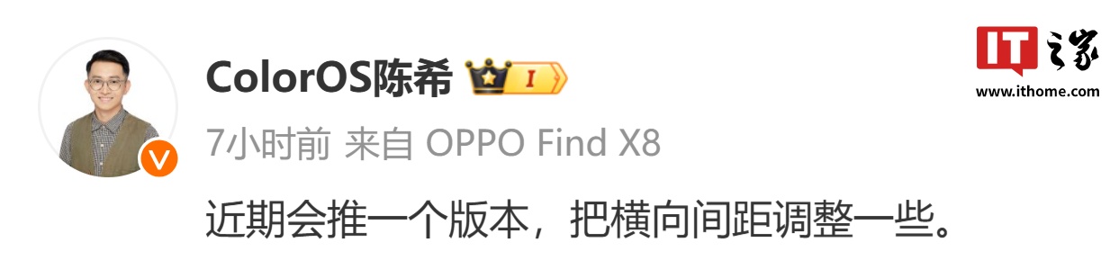 ColorOS 设计总监陈希今日在微博回应此事,表示近期会推一个版本,把横向间距调整一些。