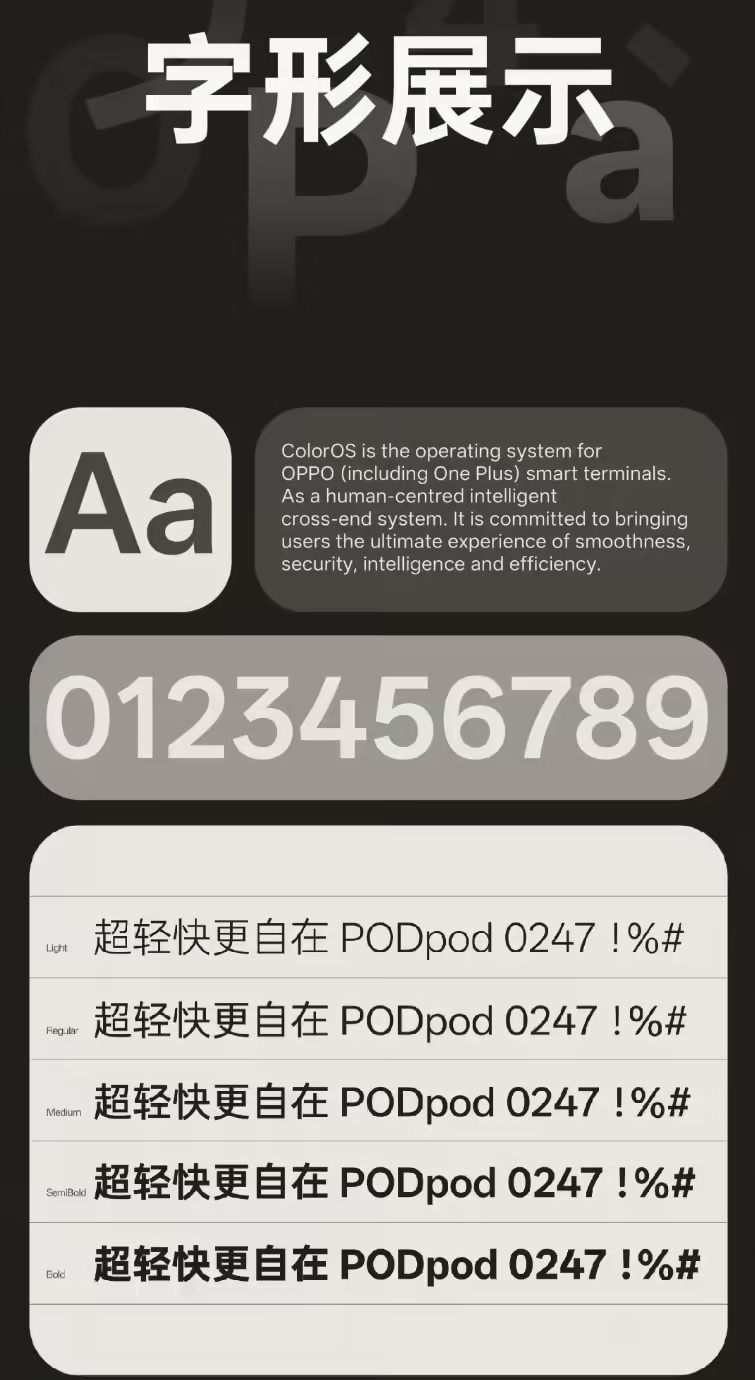 据介绍,OPPO Sans 4.0 针对西文与数字造型的表现力进行了优化,中宫更加圆润饱满,端口更加开阔,字符特点更加鲜明,提高了造型上的表现力和屏幕上的阅读感受,更适合展示使用。