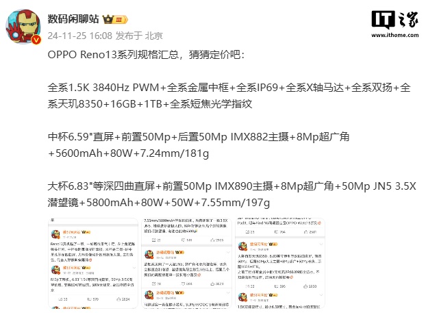 IT之家 11 月 25 日消息,OPPO Reno13 系列及 IoT 生态新品发布会将于今日 19:00 举行,在新机正式亮相之前,博主 @数码闲聊站 曝光了这两款新机的主要配置。