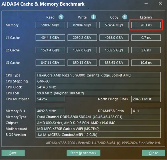 官方公布的截图显示,开启该功能后,内存延迟为 70.3ns。