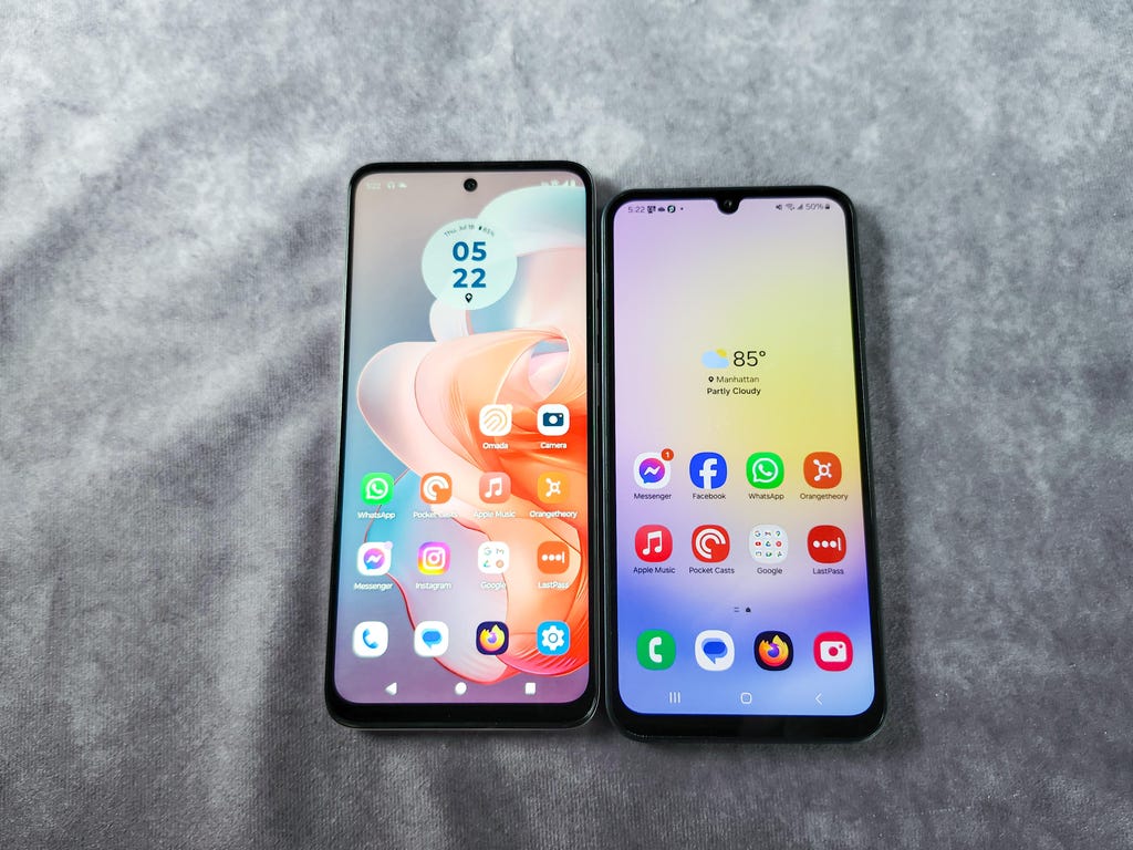 Moto G Power 5G(左)支持无线充电,而三星Galaxy A25 5G(右)将获得更多年的软件和安全更新。Mike Sorrentino/CNET
