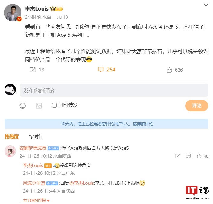 IT之家 11 月 26 日消息,网友近日针对一加新机命名为“Ace 4”还是“Ace 5”展开讨论,一加中国区总裁李杰今日发文确定了新机为「一加 Ace 5 系列」。