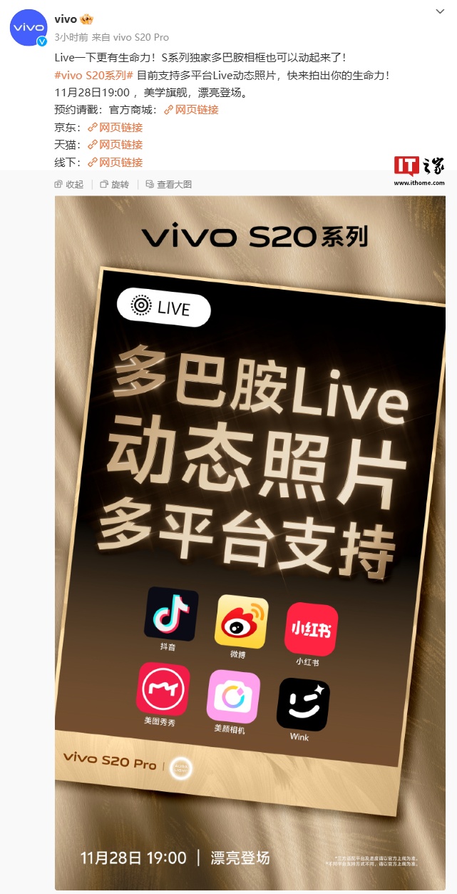据IT之家此前报道,vivo S20 系列手机独创“多巴胺 Live 动态照片”,照片边框可随 Live 内容律动。