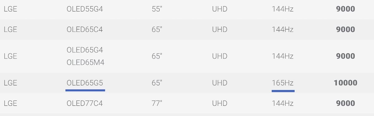 而根据行业标准组织视频电子标准协会(VESA)的 ClearMR 认证,65 英寸的 LG OLED65G5 电视在 4K 分辨率(3840 x 2160 像素)下刷新率达到了 165Hz。作为对比,2024 款 G4 OLED 刷新率为 144Hz,更早型号刷新率为 120Hz。