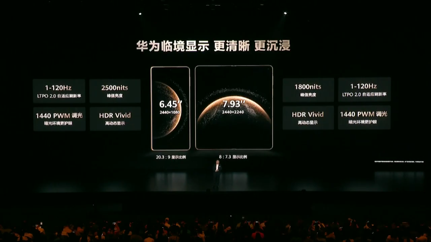 华为 Mate X6 内外屏尺寸更大,内屏尺寸达 7.93 英寸,峰值亮度 1800nit,外屏尺寸达 6.45 英寸,峰值亮度 2500nit。
