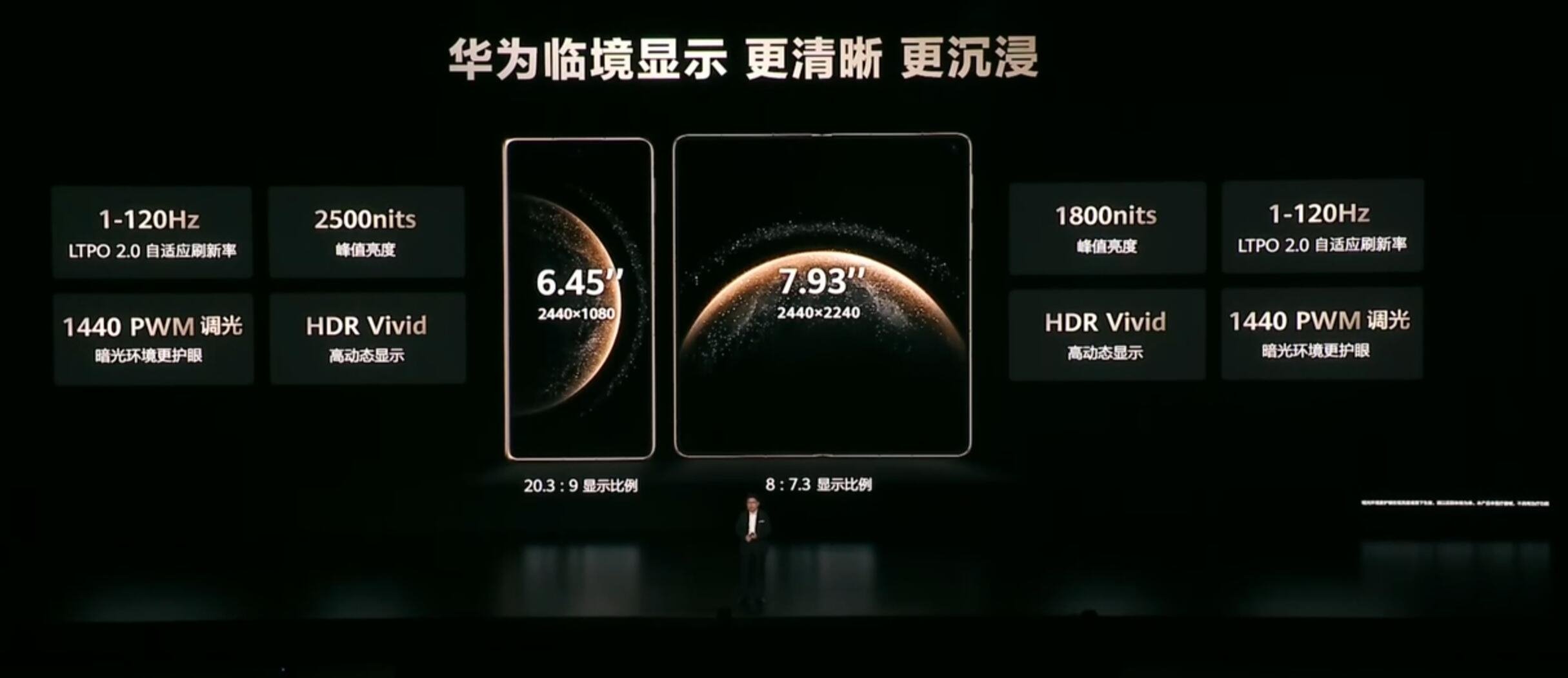 内屏尺寸是7.93英寸,分辨率为2440×2240,峰值亮度1800尼特,同样是采用LTPO 2.0,支持1-120Hz自适应刷新率,支持华为临境显示,支持1440Hz PWM调光。