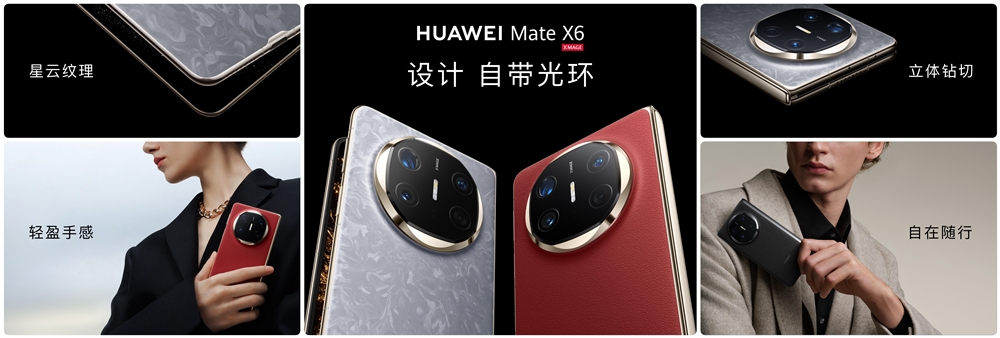 工业设计上,传承Mate X系列经典寰宇家族化设计语言,华为Mate X6匠心打造“寰宇星轨”设计,外圈金属侧立面以立体钻切工艺打磨出优雅切面。华为Mate X6通过创新材料应用和架构设计带来轻薄舒适的握持手感。拥有星云灰、星云白、寰宇红、深海蓝、曜石黑五款配色。