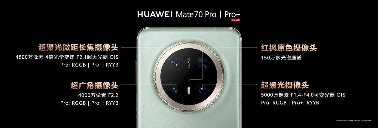 需要注意的是,Mate 70 Pro主摄采用RGGB,Mate 70 Pro+主摄则是RYYB。