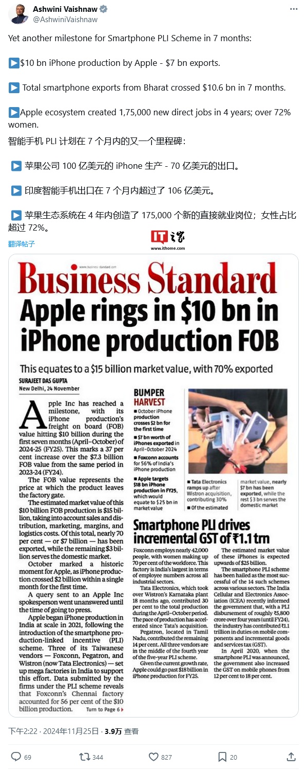IT之家 11 月 26 日消息,印度电子与信息技术部长阿什维尼・维什瑙(Ashwini Vaishnaw)昨日(11 月 25 日)在 X 平台发布推文,宣布在 2024 年 4 月至 10 月期间,苹果 iPhone 在印度离岸价格(FOB)产值解锁 100 亿美元(IT之家备注:当前约 724.97 亿元人民币)里程碑,同比增长 37%。